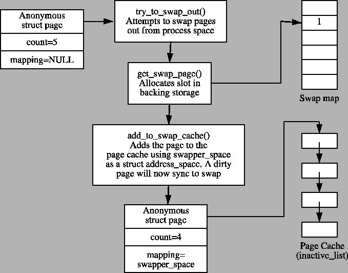 If, on the other hand, a page fault occurs for a page that is ``swapped out'', the logic in do_swap_page() will check to see if the page exists in the swap cache by calling lookup_swap_cache(). If it does, the PTE is updated to point to the page frame, the page reference count incremented and the swap slot decremented with swap_free().