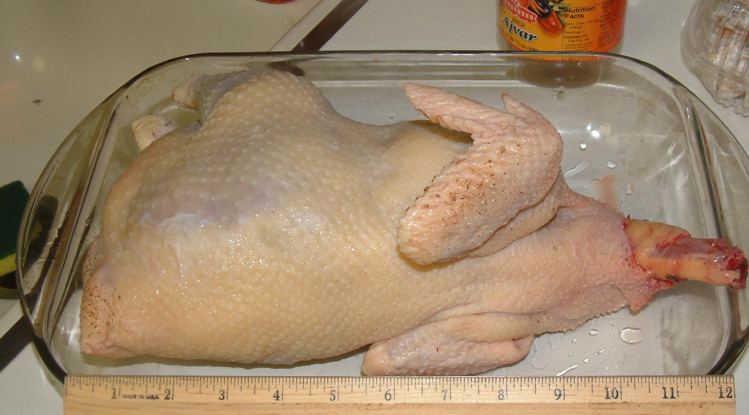 To pluck it, I scalded it in 150F water for 30 seconds, after which removing feathers was very easy. This is a very fat and very heavy chicken.